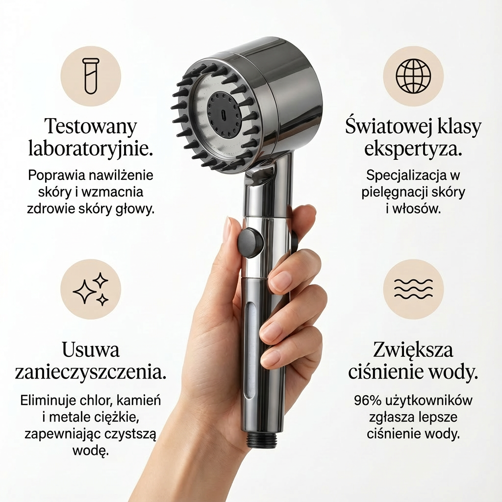Wysokociśnieniowa głowica prysznicowa z filtrem poprawia jakość wody. Pomaga zredukować chlor i zanieczyszczenia, zapewniając miękkość skóry i włosów.