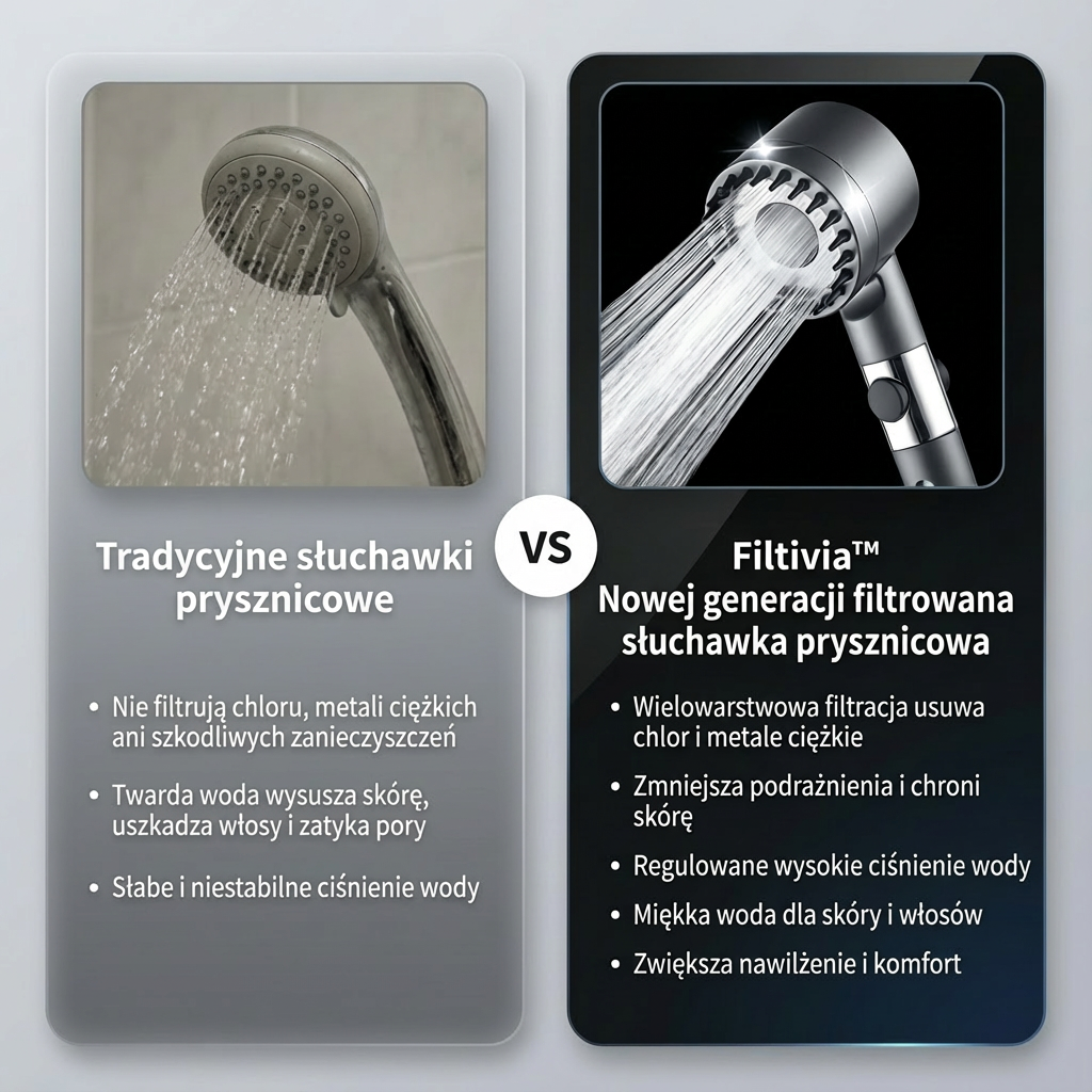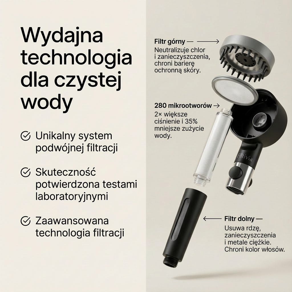 Dzięki Filtivia możesz cieszyć się ukojoną skórą, miękkimi włosami i niezrównanym komfortem po każdym prysznicu.